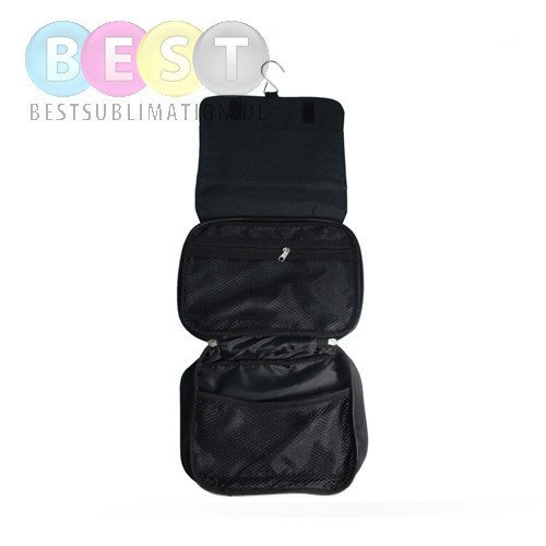 Kostmetiktasche, bedruckbar mittels Sublimationsverfahren. Mit verschiedenen Fächern für den Kosmetikbedarf und einem praktischen Haken.