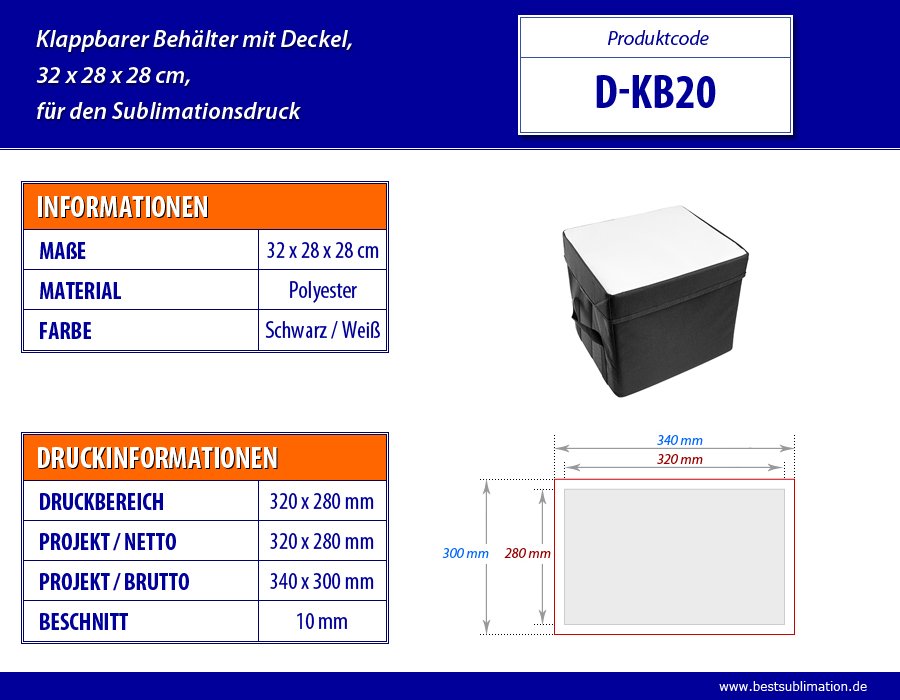 Klappbarer Behälter, bedruckbar mittels Sublimationsverfahren. Der Druck erfolgt auf den Behälterdeckel. Multifunktionaler Behälter für Schmuck, Spielzeug, Büroutensilien, etc. Im eingeklappten Zustand leicht zu verstauen. Aus strapazierfähigem Gewebe. Mit zwei handlichen Griffen für eine einfache Handhabung.