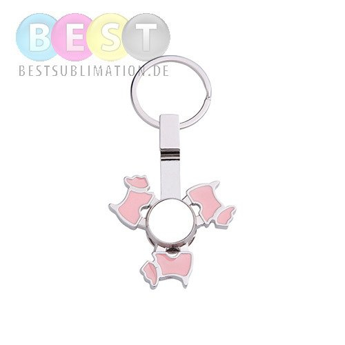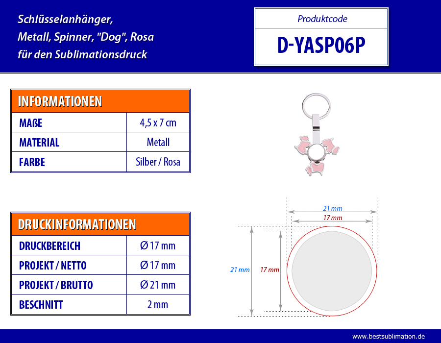 Schlüsselanhänger aus Metall, bedruckbar mittels Sublimationsverfahren. Der Aufdruck erfolgt auf eine dem Anhänger beiliegende Metallplatte, welche anschließend auf die ausgefräßte Stelle des Anhängers geklebt wird. Der Anhänger kommt in einer, innen mit schwarzem Samt ausgearbeiteten, dekorativen Schachtel.