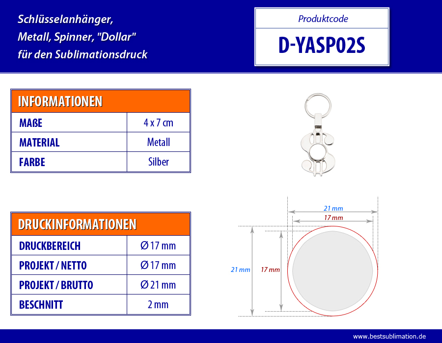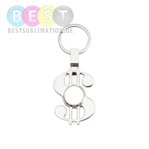 Schlüsselanhänger aus Metall, bedruckbar mittels Sublimationsverfahren. Der Aufdruck erfolgt auf eine dem Anhänger beiliegende Metallplatte, welche anschließend auf die ausgefräßte Stelle des Anhängers geklebt wird. Der Anhänger kommt in einer, innen mit schwarzem Samt ausgearbeiteten, dekorativen Schachtel.
