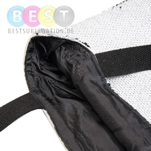 Tasche mit weißen Pailletten für den Sublimationsdruck. Eine Seite besteht aus einem Polyesterstoff, die andere aus zweifarbigen Pailletten. Der Druck ist zu beiden Seiten möglich.