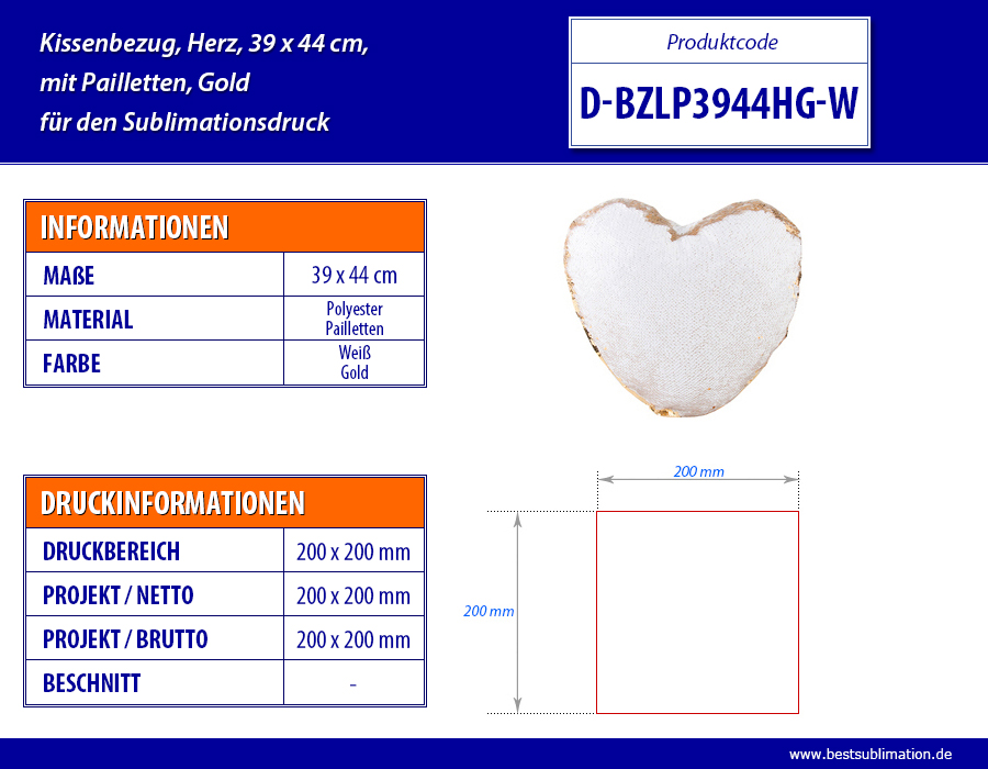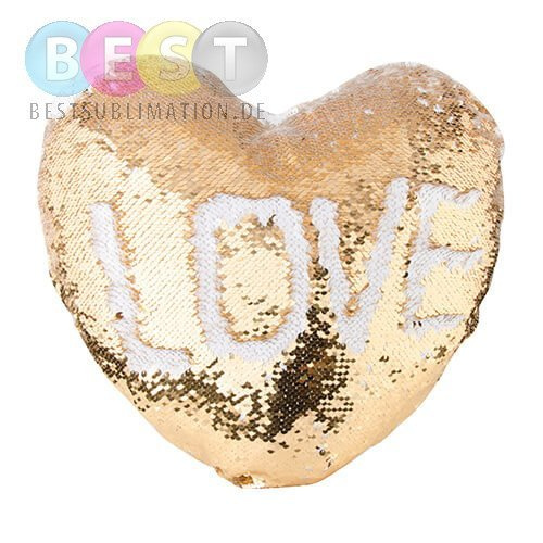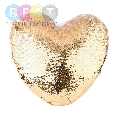 Glänzender Kissenbezug für den Sublimationsdruck. Der Bezug besteht je zur Hälfte aus Polyester und goldfarbenen Pailletten. Der Aufdruck kann auf der gesamten Fläche erfolgen. Wir empfehlen hierzu auch unsere günstig angebotenen Kissenfüller.