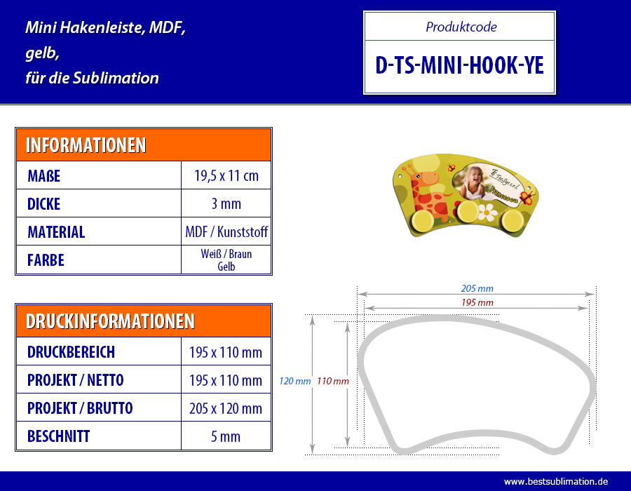 Mini Hakenleiste aus MDF für den Sublimationsdruck. Mit drei runden Haken in gelb.