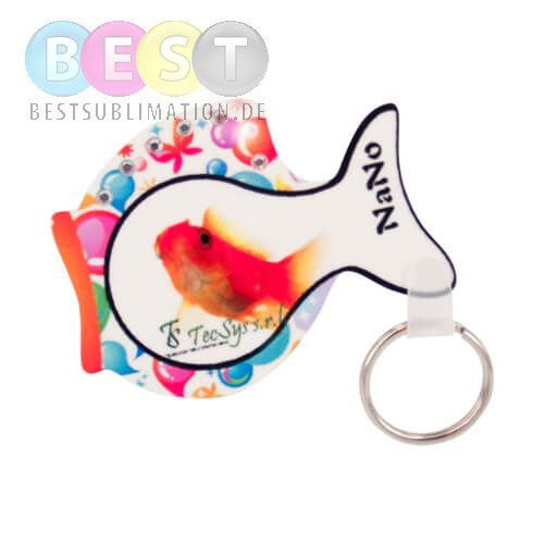 Schlüsselanhänger aus Kunststoff, bedruckbar mittels Sublimationsverfahren. Mit metallenem Ring.
