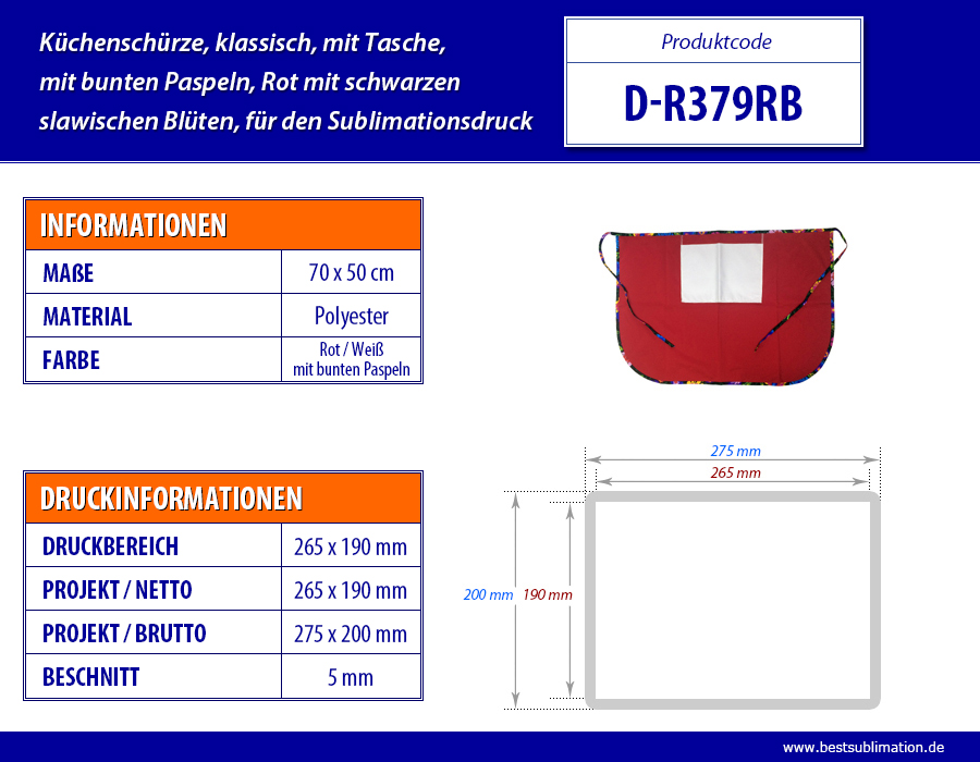 Küchenschürze, klassisch, mit Tasche, mit bunten Paspeln, Rot mit schwarzen slawischen Blüten, für den Sublimationsdruck