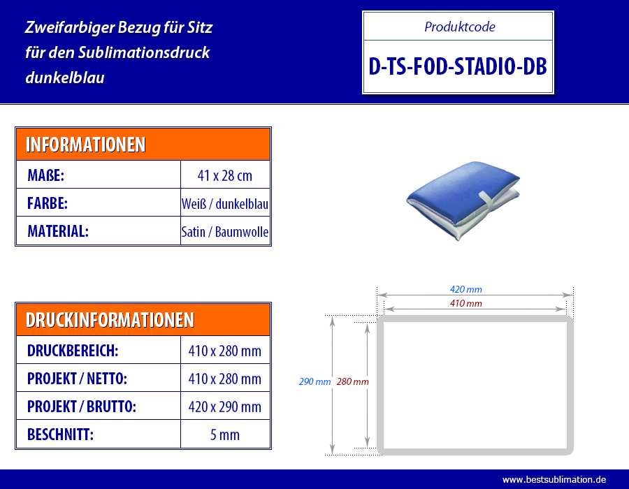 Zweifarbiger Bezug für einen Sitz für den Sublimationsdruck geeignet. Druckseite aus weißem Satin, Rückseite bestehend aus roter Baumwolle. Der Bezug ermöglicht das Umklappen des Sitzes auf die Hälfte, per Klettverschluss zu befestigen. Empfohlen für das Produkt TS-IMB-STADIO.