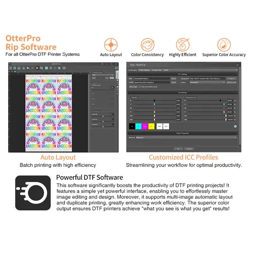 Otter RIP-Software im Lieferumfang enthalten. Diese Software steigert die Produktivität Ihrer DTF-Druckprojekte erheblich! Es verfügt über eine einfache, aber leistungsstarke Benutzeroberfläche, mit der Sie die Bildbearbeitung und -gestaltung mühelos meistern können. Darüber hinaus unterstützt es das automatische Layout mehrerer Bilder und den Duplikatdruck, was die Arbeitseffizienz erheblich steigert. Eine perfekte Farbausgabe stellt sicher, dass DTF-Drucker Ergebnisse erzielen, die Sie sehen.
